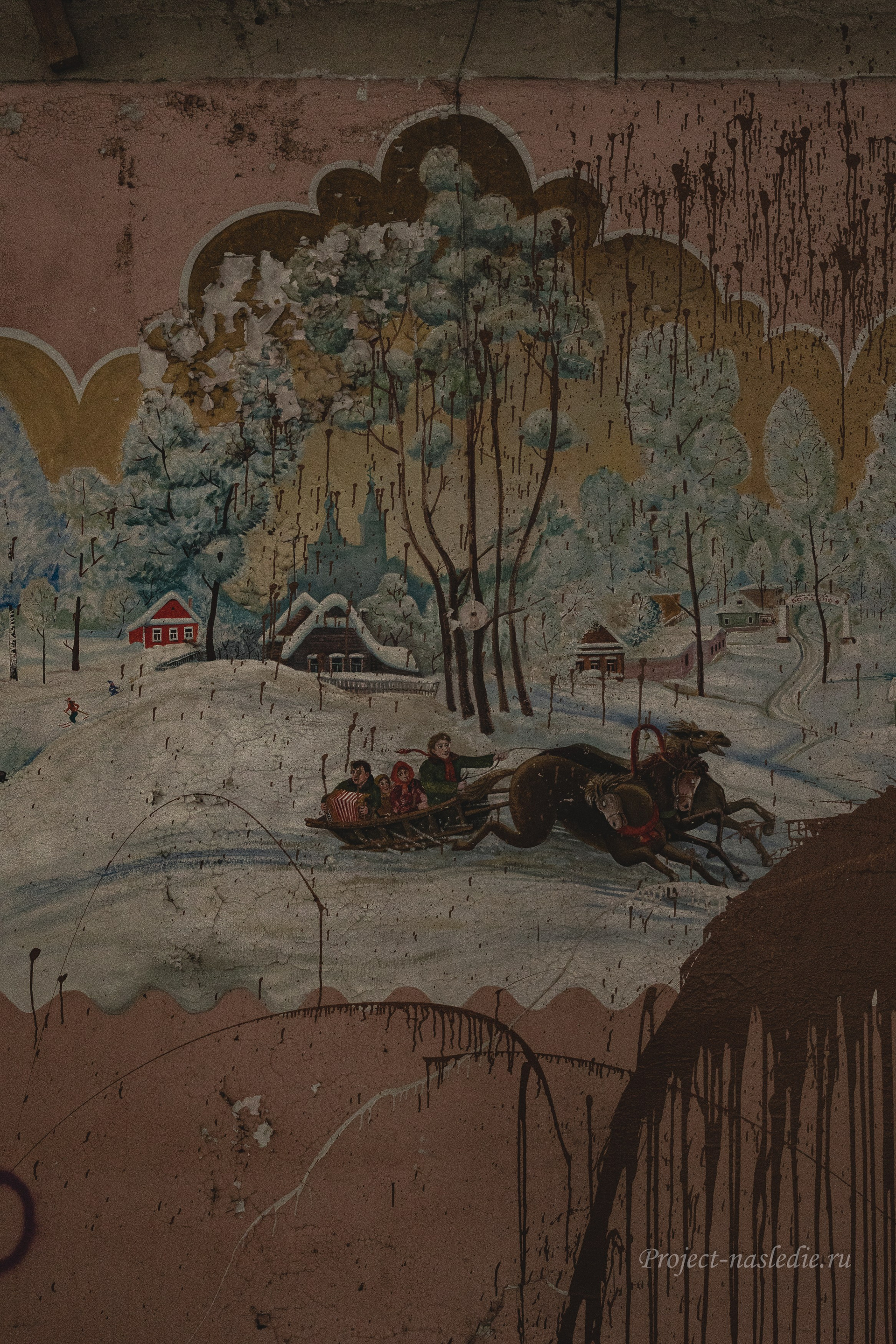 В усадьбе фон Мекк все ещё можно увидеть остатки советской эпохи. На стенах можно разглядеть потускневшие рисунки. В большом зале даже осталось изображение Московского Кремля. А под потолком виднеются картины, отражающие темы из советского прошлого.