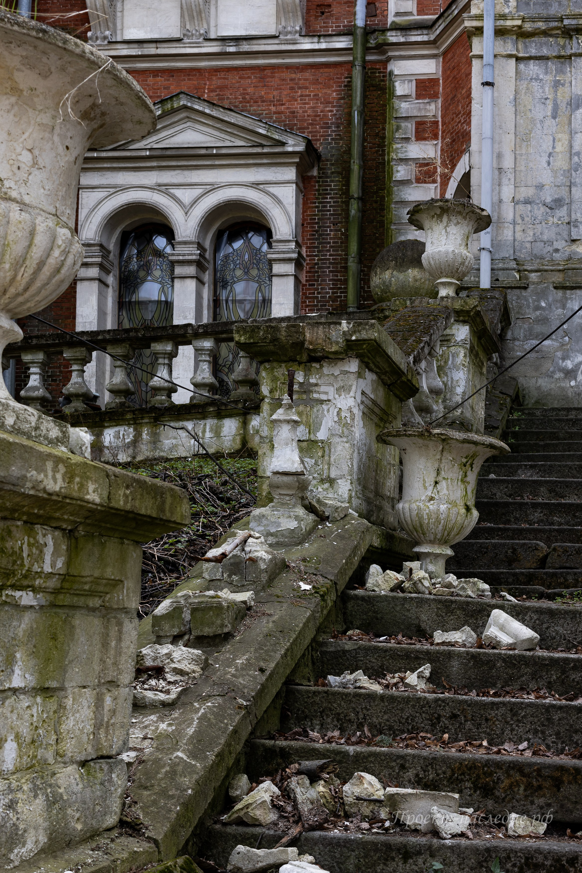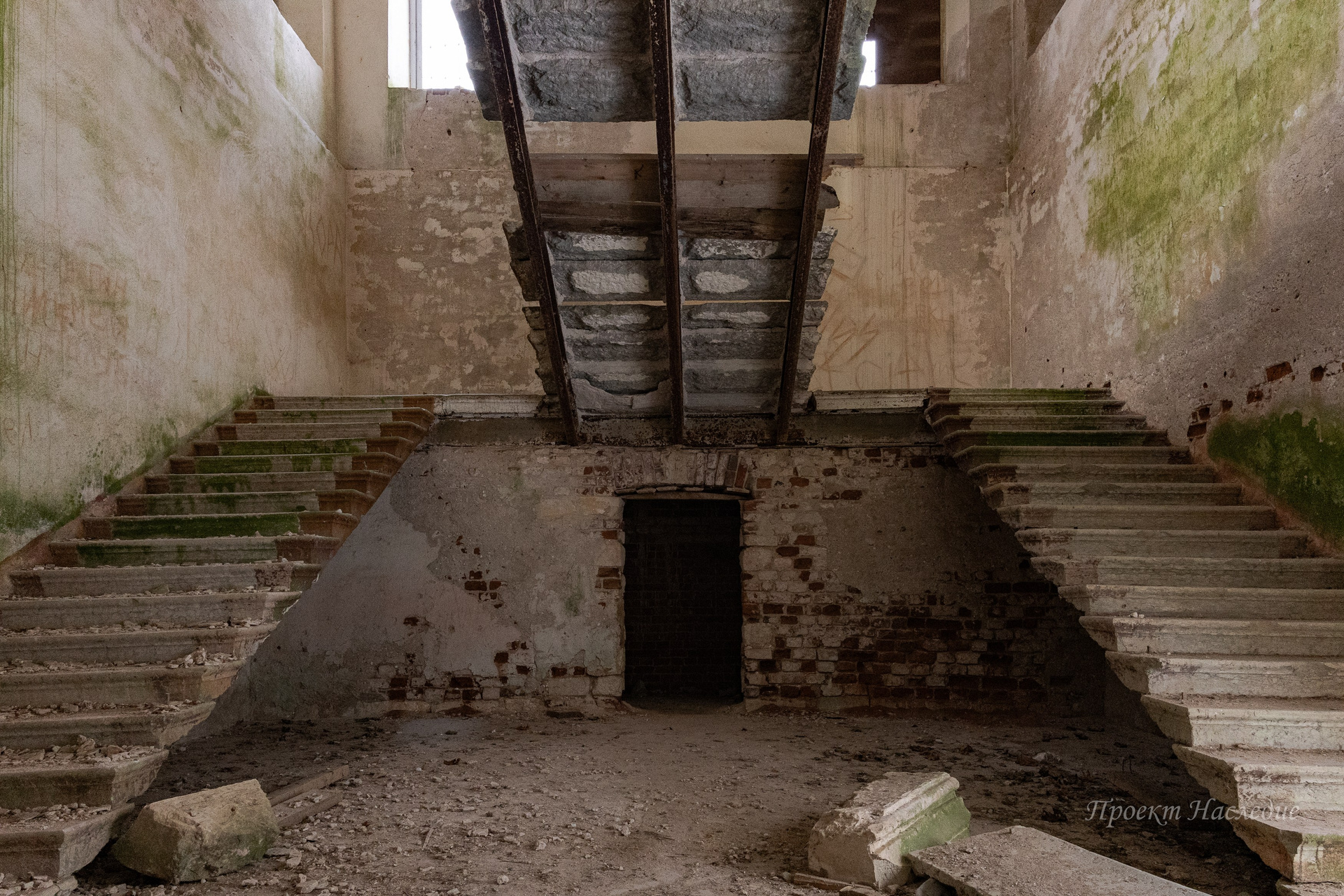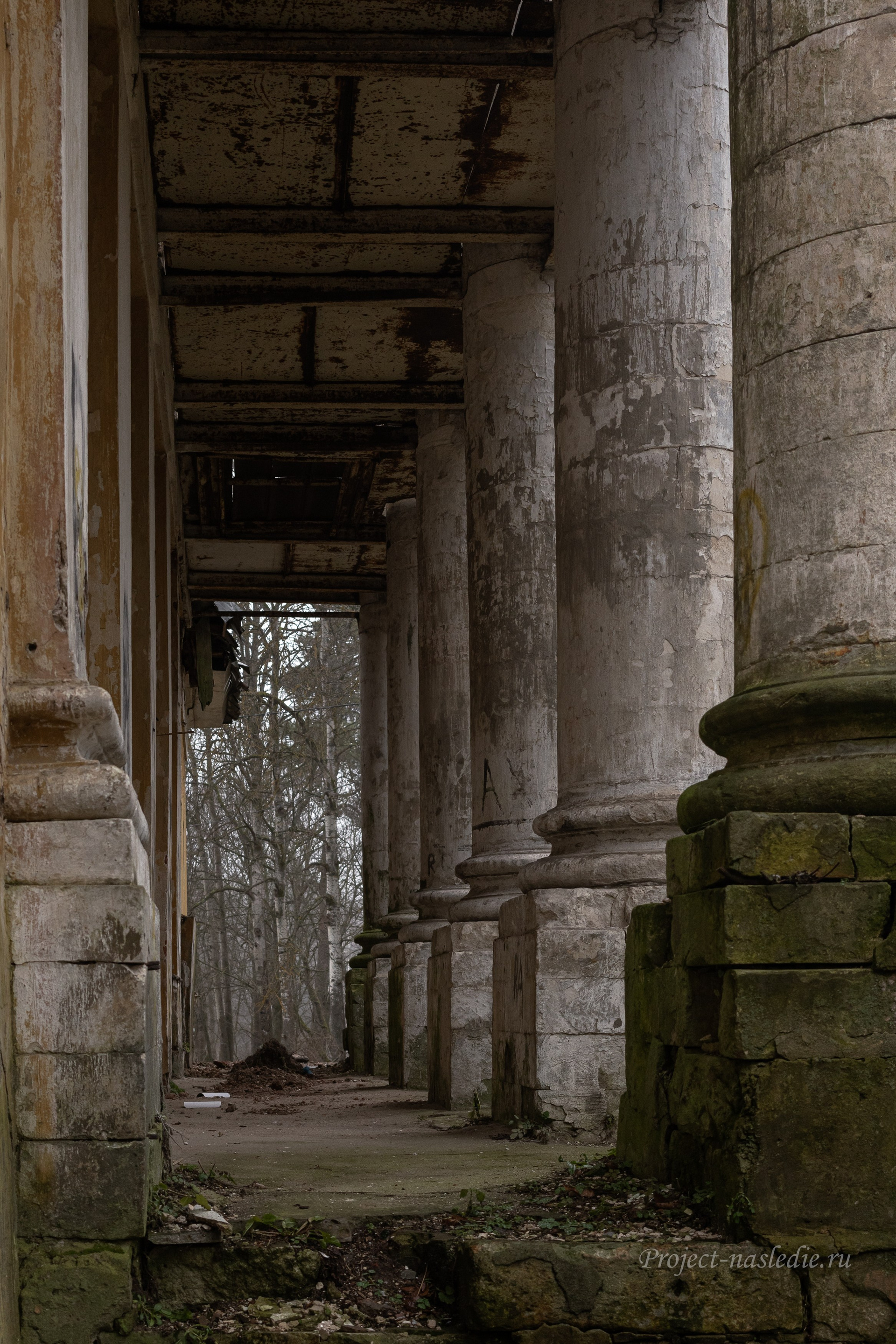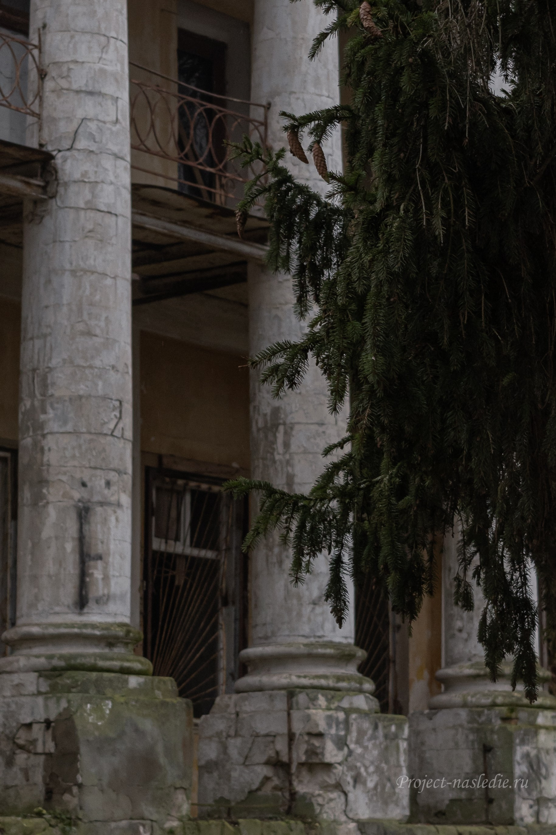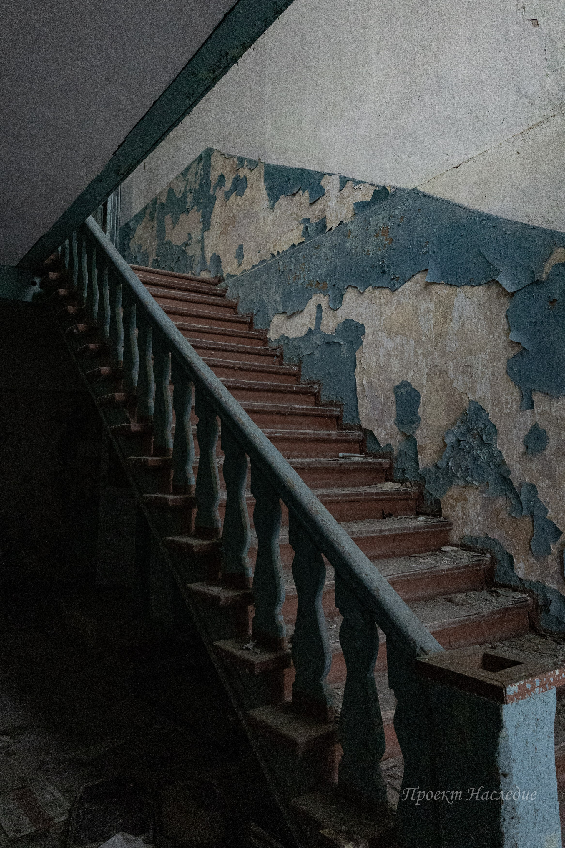Пансионат пришел в упадок, и в его стенах можно увидеть следы времени: штукатурка осыпается, лепнина отваливается, графити на стенах…