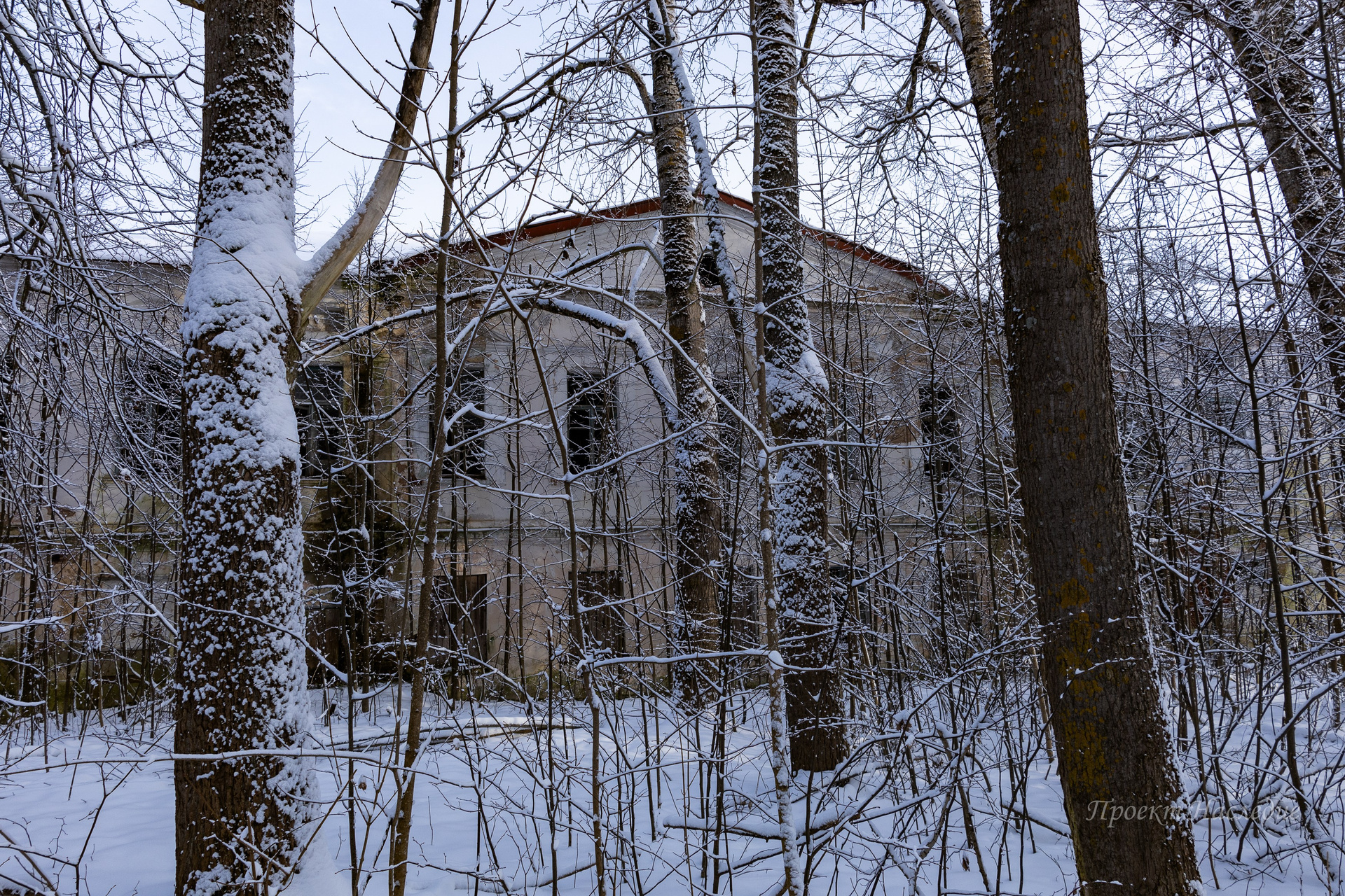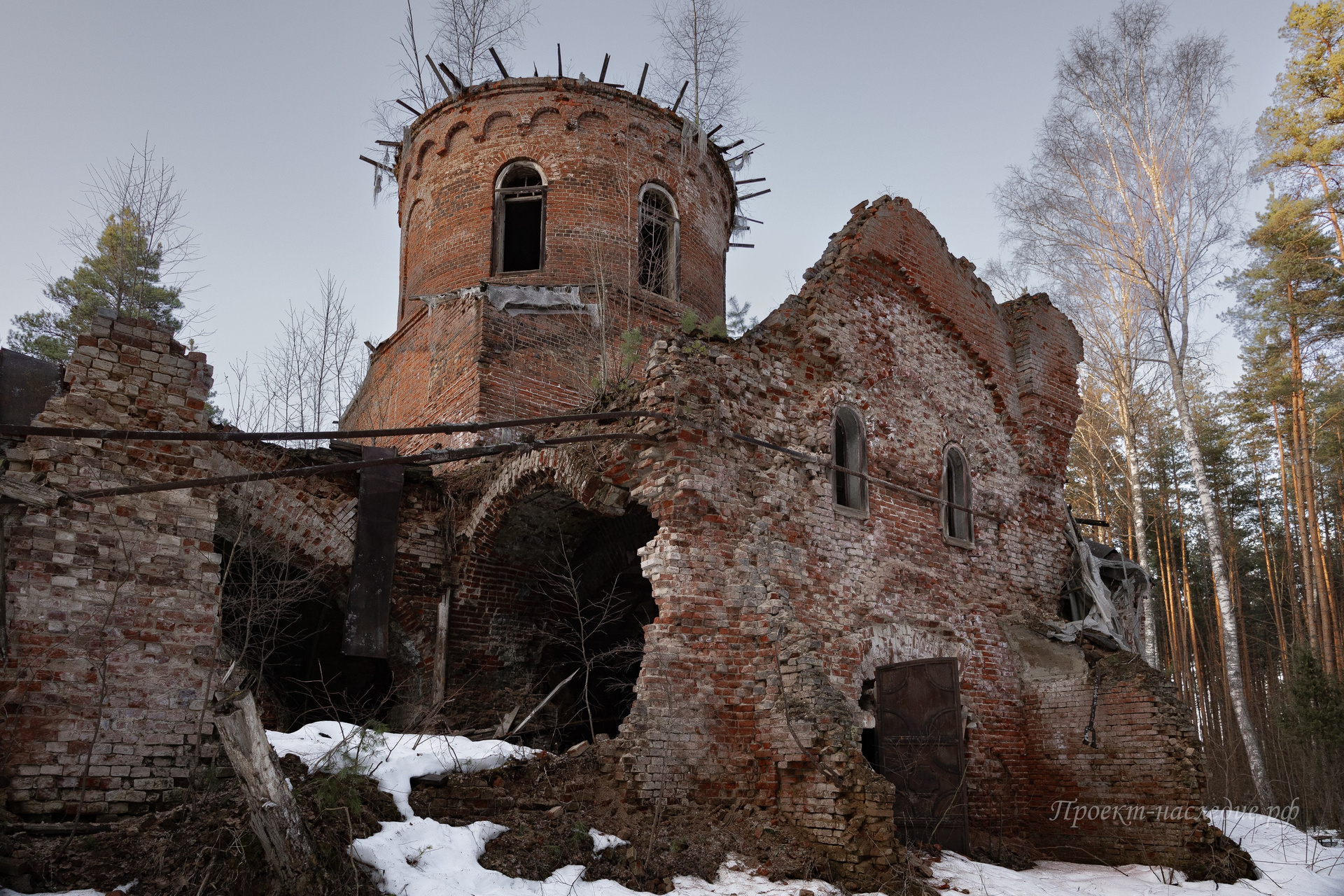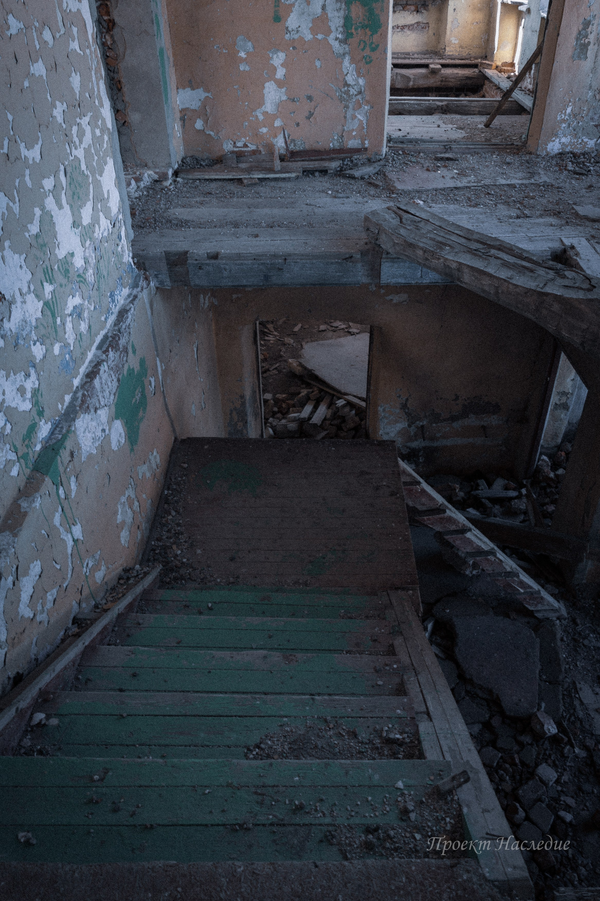 Его развалины находятся справа при въезде в поселок. На крыше уже вырос порядочный сосновый лес, а многие конструкции обрушились. Масштаб здания все еще впечатляет.